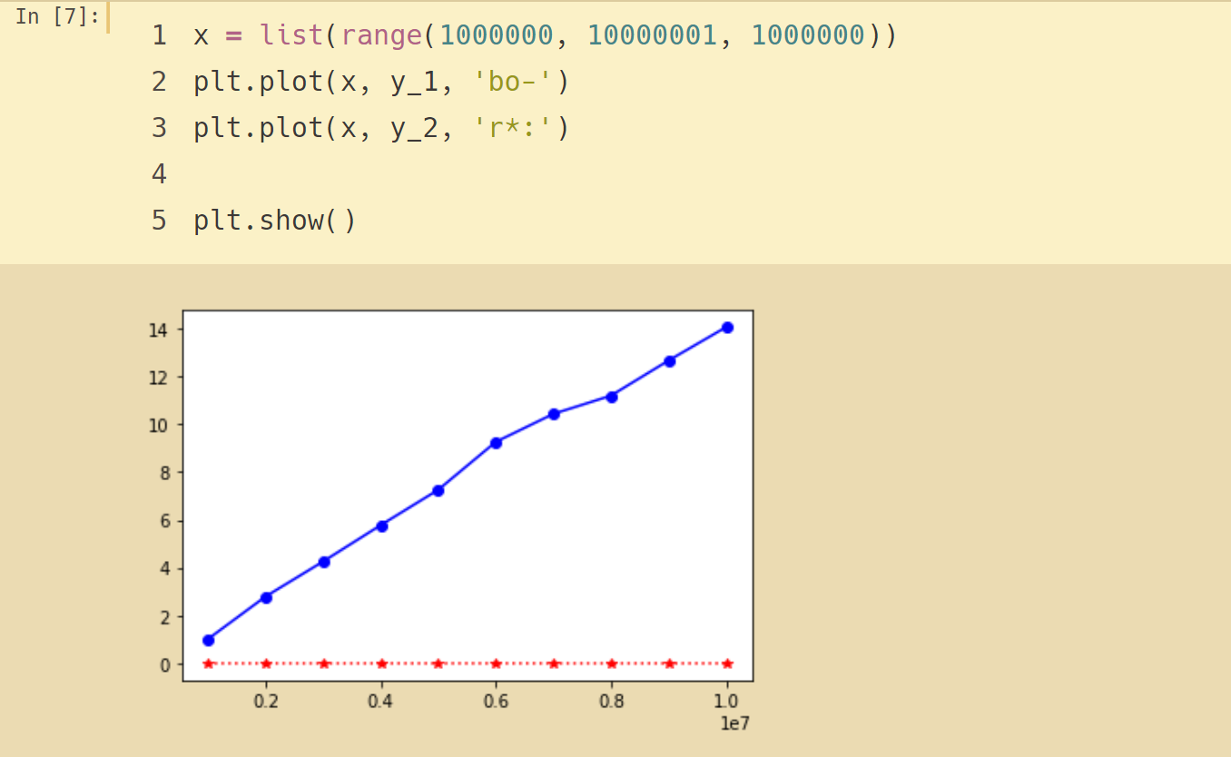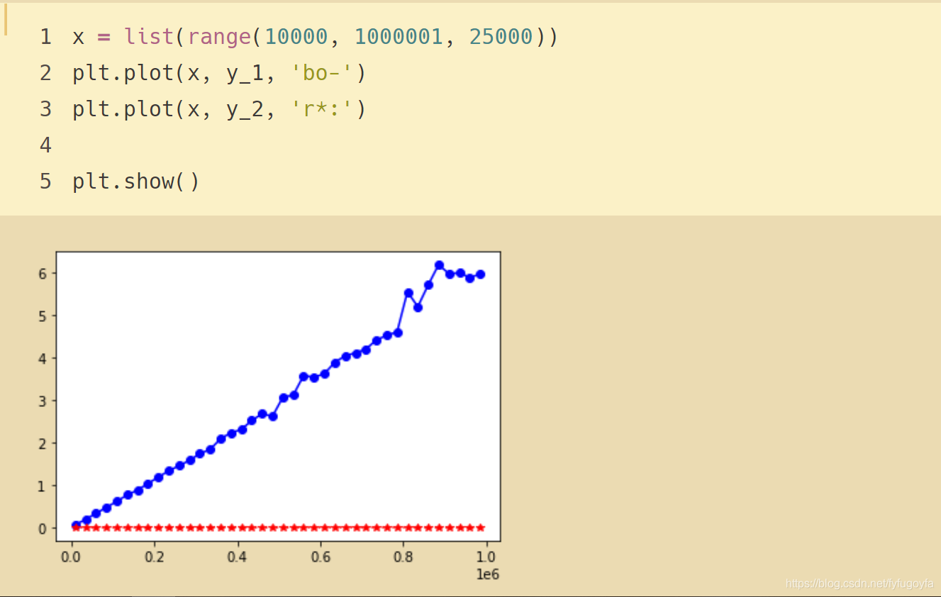 将试验结果可视化,可以看出增长趋势:pop()是平坦的常数,pop(0)是线性增长的趋势。