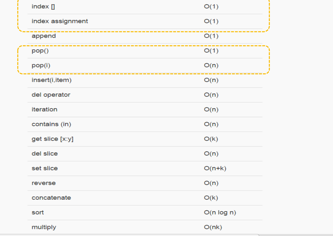 我们注意到 pop 这个操作,pop()是从列表末尾移除元素,时间复杂度为O(1);pop(i)从列表中部移除元素,时间复杂度为O(n)。