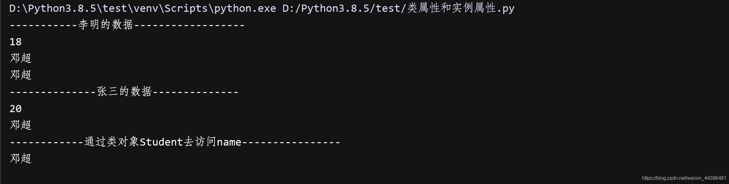 Student.name='邓超'   #通过类对象去修改类属性  因为name属于类属性