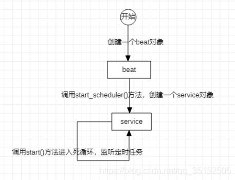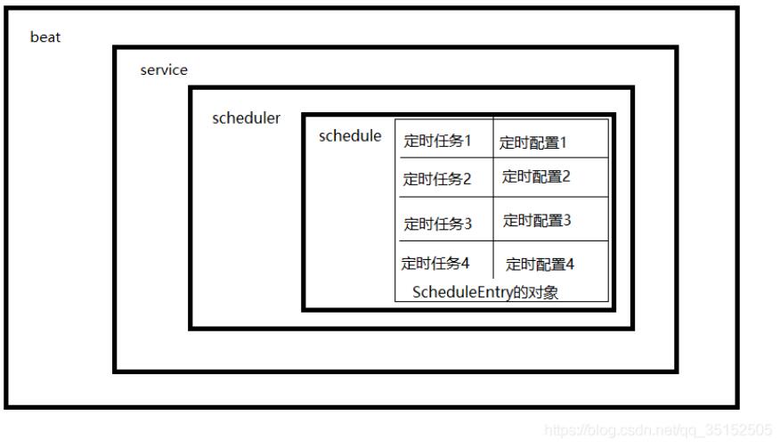 上图是beat的主要组成结构,beat中包含了一个service对象,service中包含了一个scheduler对象,scheduler中包含了一个schedule字典,schedule中key对应的的value才是真正的定时任务,是整个beat中最小的单元。