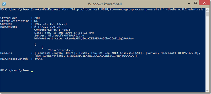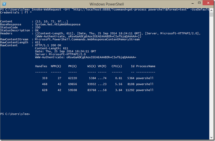 默认我让它监听在8888端口,集成了Windows验证,但是仍然可以在参数中配置。这里我打开了另一个PowerShell窗口,并执行了“get-process powershell”