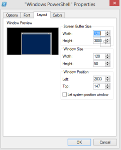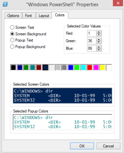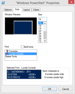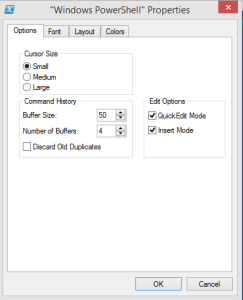 右击标题栏选择”属性”弹出powershell控制台对话框。在这里有四个选项卡:选项、字体、布局和颜色。