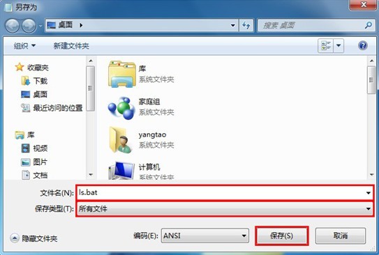 2.接下来,将该新建文档“另存为”,并命名为“ls.bat”,保存类型为“所有文件”,然后,点击“保存”按钮即可。