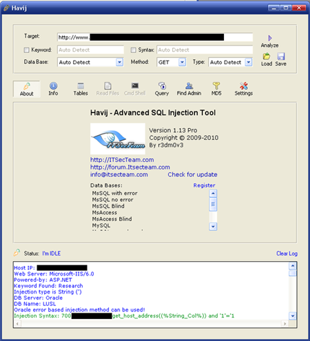 Havij是一款自动化的SQL注入工具,它能够帮助渗透测试人员发现和利用Web应用程序的SQL注入漏洞。Havij不仅能够自动挖掘可利用的SQL 查询,还能够识别后台数据库类型、检索数据的用户名和密码hash、转储表和列、从数据库中提取数据,甚至访问底层文件系统和执行系统命令,当然前提是有 一个可利用的SQL注入漏洞。Havij支持广泛的数据库系统,如 MsSQL, MySQL, MSAccess and Oracle。 Havij支持参数配置以躲避IDS,支持代理,后台登陆地址扫描。