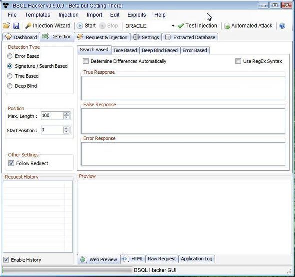 BSQL Hacker是由Portcullis实验室开发的,BSQL Hacker 是一个SQL自动注入工具(支持SQL盲注),其设计的目的是希望能对任何的数据库进行SQL溢出注入。 BSQL Hacker的适用群体是那些对注入有经验的使用者和那些想进行自动SQL注入的人群。BSQL Hacker可自动对Oracle和MySQL数据库进行攻击,并自动提取数据库的数据和架构。