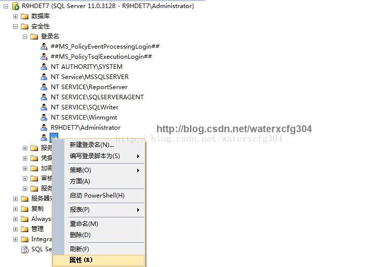 1.依次进入“安全性”、“登录名”、“sa”,右击“sa”选择属性。