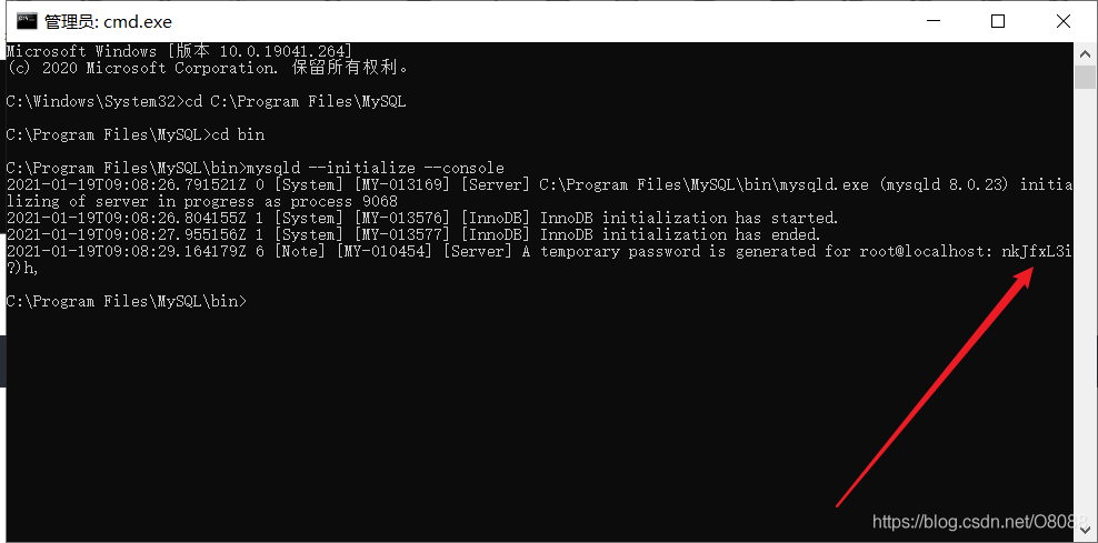 输入mysqld --initialize --console,进行初始化。该步可以得到mysql的初始密码,root@localhost后面那一串就是初始密码,先记录下来,待会要用到