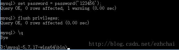 区别与以前版本,5.7版本在表的结构上有所修改,使用 set password = password(‘123456'); 来设置密码。 并刷新权限 flush privileges;