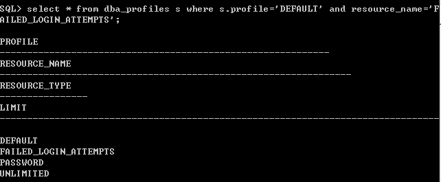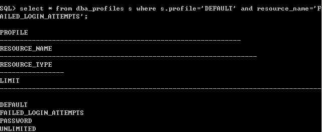 SQL> select * from dba_profiles s where s.profile='DEFAULT' and resource_name='FAILED_LOGIN_ATTEMPTS';
