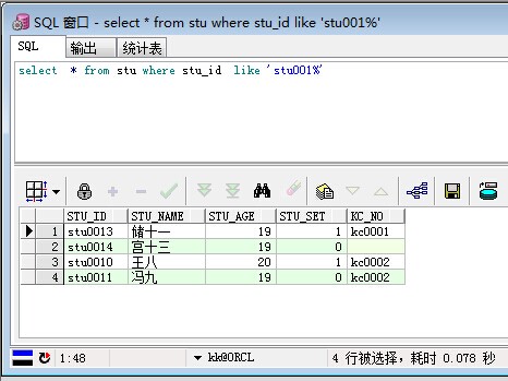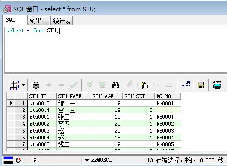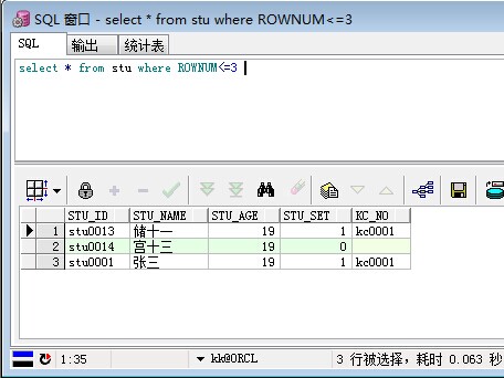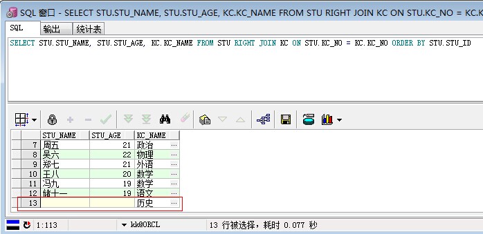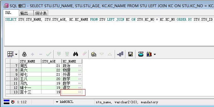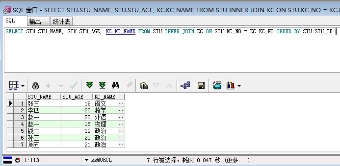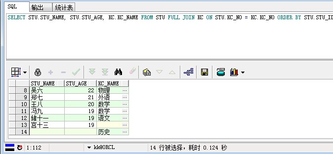 SELECT STU.STU_NAME, STU.STU_AGE, KC.KC_NAME FROM STU FULL JOIN KC ON STU.KC_NO = KC.KC_NO ORDER BY STU.STU_ID