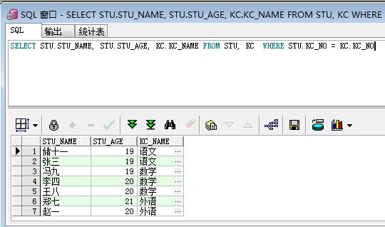 SELECT STU.STU_NAME, STU.STU_AGE, KC.KC_NAME FROM STU, KC WHERE STU.KC_NO = KC.KC_NO