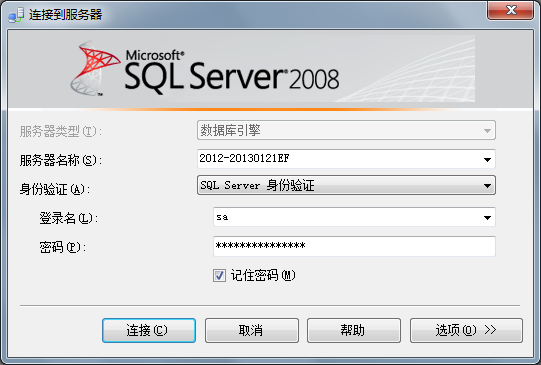 当然,自己装SQL Server 2008的时候根本就没有用sa登录的方法,装数据库的时候是用windows身份登录的。