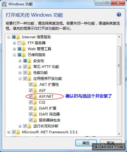 首先在确认安装了IIS,并且安装了IIS的ASP.Net组件,位置在【Internet 信息服务】--【万维网服务】--【应用程序开发功能】,勾选【ASP.Net】 。