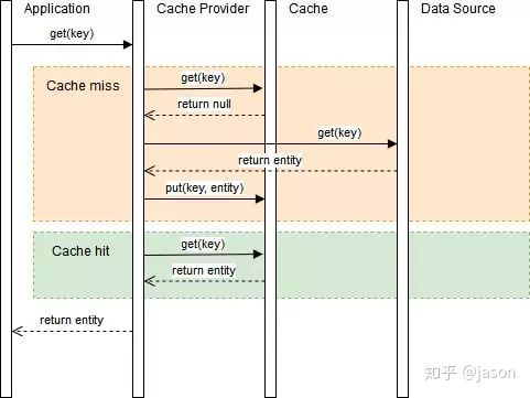 - 如果数据不在缓存中,也即 Cache miss,称作“缓存未命中”。应用程序会从数据存储的地方,如 MySQL 数据源中读取该数据,并将数据存储在缓存中,然后将其返回给客户端。