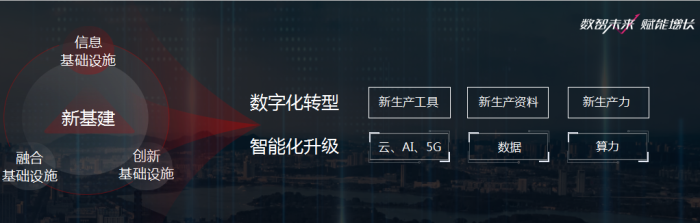 这里的新基建主要指三个方面,信息的基础设施、融合的基础设施、创新的基础设施。从信息方面来讲,数字化转型首先是指信息如何收集,如何治理,如何帮助企业做决策。融合则是如何将云、AI,5G等新技术综合应用。而说到创新,就是要考虑我们利用这些工具,这些信息化的手段,如何开发创新的生产工具,创新的生产资料及创新的生产力,最终帮助企业提高效率,提高竞争力。