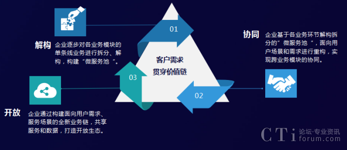 第二,业务的解构、协同、开放成为转型焦点。在底层数字基础设施平台转型的基础上,越来越多的企业更加关注上层业务的转型。