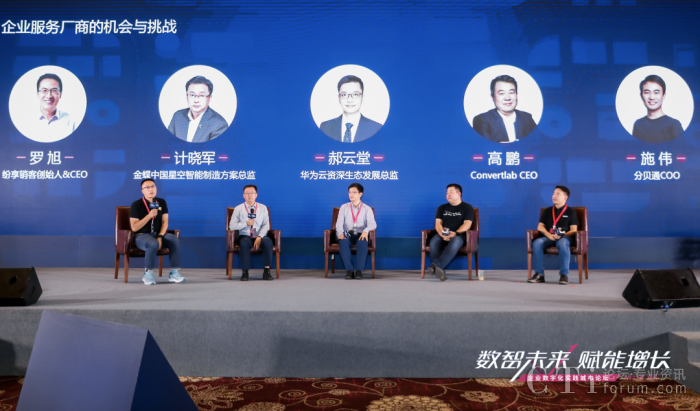 在上午主论坛的圆桌环节,纷享销客创始人CEO罗旭、金蝶中国星空智能制造方案总监计晓军、华为云资深生态发展总监郝云堂、Convertlab CEO高鹏和分贝通COO施伟就企业数字化转型过程中,厂商的机会与挑战展开了讨论。