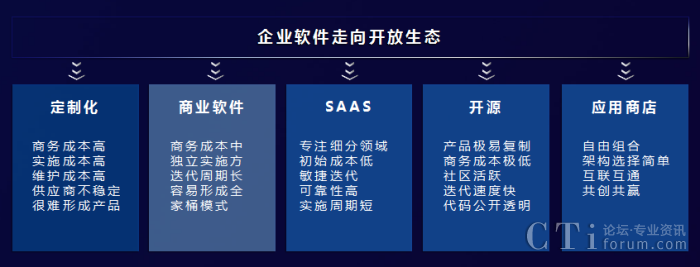 在这种差距中,国内企业软件的新模式也在逐渐形成:从定制化到商业软件,到SaaS,再到开源和应用商店,不同的产品都在并存。