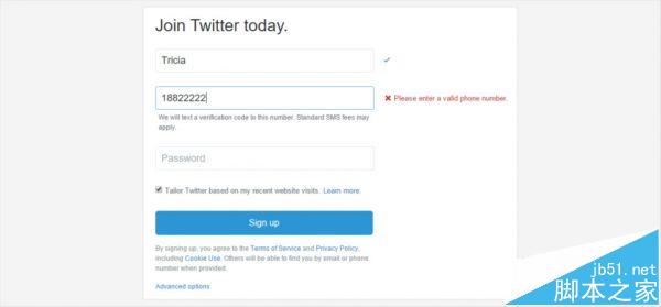下图为Twitter在注册时对用户名的要求和手机号码有效性的验证: