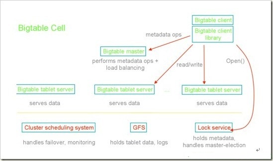 BigTable是基于GFS和MapReduce之上的,那么google既然已经有了GFS,为何还要有BigTable呢(也是我原先的一个疑问)?后来想想这和已经有操作系统文件系统为何还要有SQL SERVER数据库一样的道理,GFS是更底层的文件系统,而BigTable建立在其上面,不仅可以存储结构化的数据,而且可以更好的管理和做出负载均衡决策。