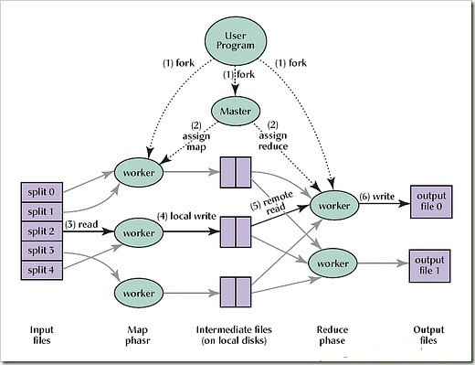 Map即映射,Reduce即规约,由master服务器把map和reduce任务分发到各自worker服务器中运行计算,最后把结果规约合并后返回给用户。这个过程可以由下图来说明。