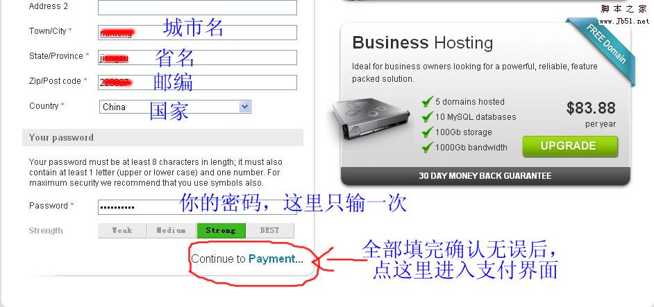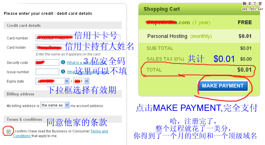 点页面下方“Continue to Payment”输入卡号、所有者英文姓名(卡面上的)、安全码(卡背面后3位数字)、有效期,选中下面的同意服务条款。点右面蓝色“MAKE PAYMENT”按钮。页面显示“Payment accepted”说明已经成功提交订单,即你注册的域名和美国主机已经付款成功。你会收到一封主题为“Welcome to SimplyHosting!”的欢迎信。