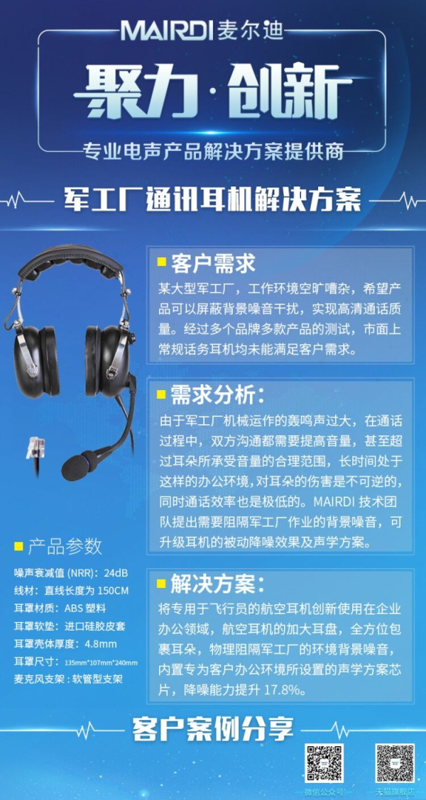 近期,收到之前合作客户的苦恼倾诉,希望在大型军工厂里,满足清晰通话,消除背景噪音困扰的需求,市面上的众多耳机都一一测试过,最终测试结果并不理想,与预想的音质效果相差甚远,噪音仍猖狂环绕,无法隔绝。导致现场通话汇报一再搁浅,通话质量的呈现足以痛到无法呼吸。每天为寻找更适合的耳机方案疯狂掉发。最后选择向麦尔迪寻求帮助。