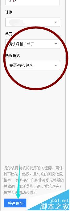 7、然后输入合适的出价,选择要添加的计划和单元,点击快速保存,这样关键词就添加好了,等待审核即可。