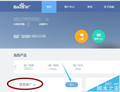 2、然后进入推广首页,点击搜索推广后面的“进入