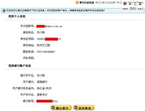 注意:在提交认证资料后,请立即查看您的银行卡余额并记下它,然后在1-2个工作日内到银行柜台、ATM取款机、电话银行或网上银行查询,多出的金额就是支付宝给您汇的确认资金。