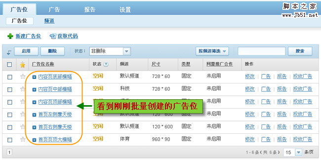 2) 可以看到批量创建的广告位,如下图所示。至此所有操作已完成,您可以到网站查看实际投放效果。