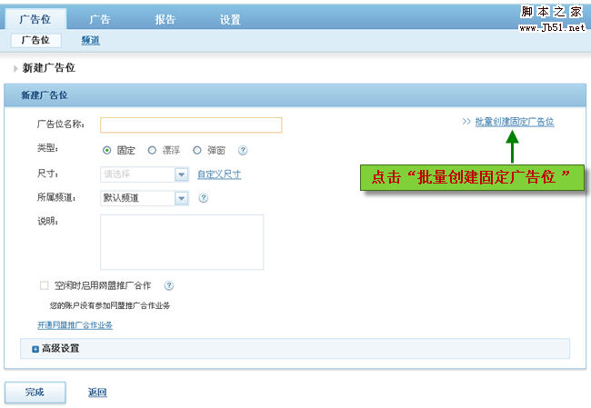 1) 通过导航“广告位”→“广告位”→“新建广告位”进入下图所示页面,按照图示点击相关链接。