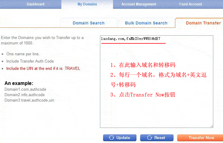 4、新页面中,框内输入需要转移的域名和转移码,然后点击“Transfer now”橙色按钮。