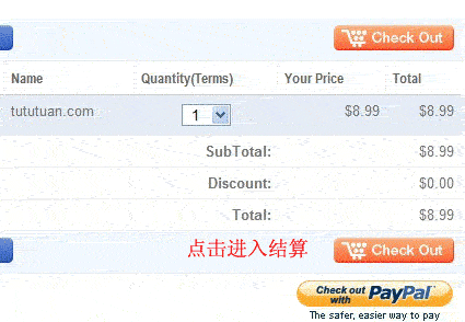 6、新页面中,确认所需要续费的域名和各类信息,然后点击右边的“Check OUT”橙色按钮,进入结算页面。