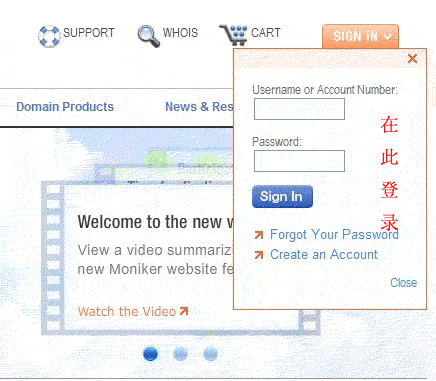 1、进入Moniker.com官方网站,http://www.Moniker.com ,鼠标放到右上角“SIGN IN”黑色按钮,使用您的帐号和密码登录。