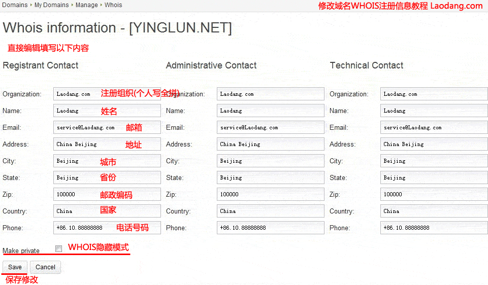 页面底部的 Whois Informations 区域,点击 ”Edit All“按钮,开始编辑 WHOIS 注册信息。