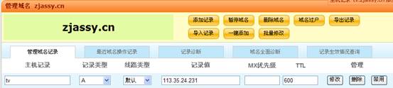 只需在“主机记录”里输入二级域名,例如TV,“记录类型”选择“A”,“记录值”里输入网站IP地址,假如是113.35.24.231,其余项不用管,点击“添加”即可。10秒不到可解析完成。