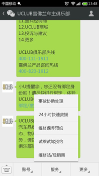 一般用户在微信平台上关注该账号,进入对话界面后,通过点击菜单,便可享受相关服务内容。而积分查询、幸运摩天轮、UCLUB商城、维修保养预约四项特定服务内容则针对成功绑定的雪佛兰会员开放。
