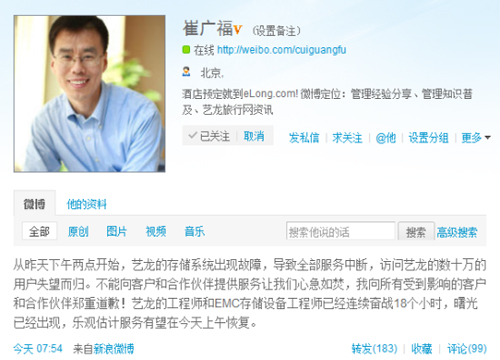 今日上午7:54,崔广福通过微博对外证实,艺龙网站的无法访问,是由于存储系统出现故障,导致全部服务中断,因此让访问艺龙的数十万用户失望而归。