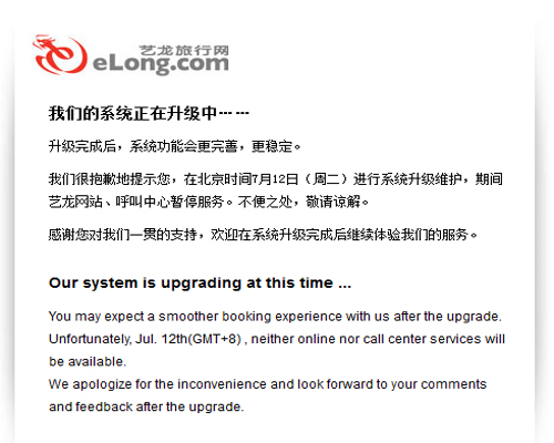 截至发稿时,艺龙服务依然没有恢复。其主页依然显示“我们的系统正在升级中……”