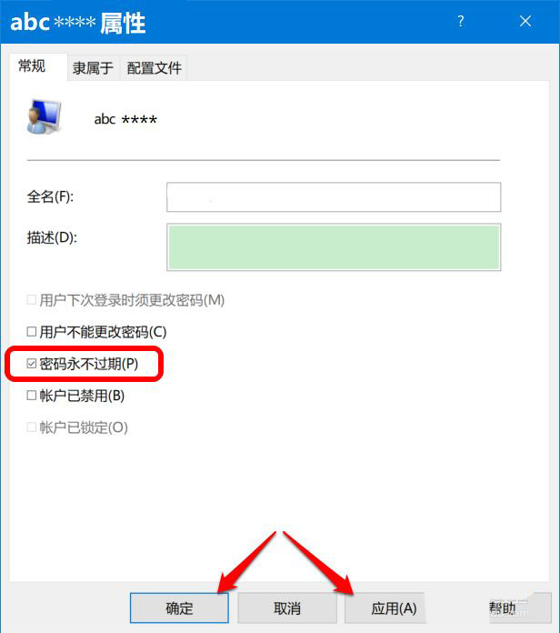 在 abc**** 属性窗口中,可以看到没有复选 密码永不过期(P);