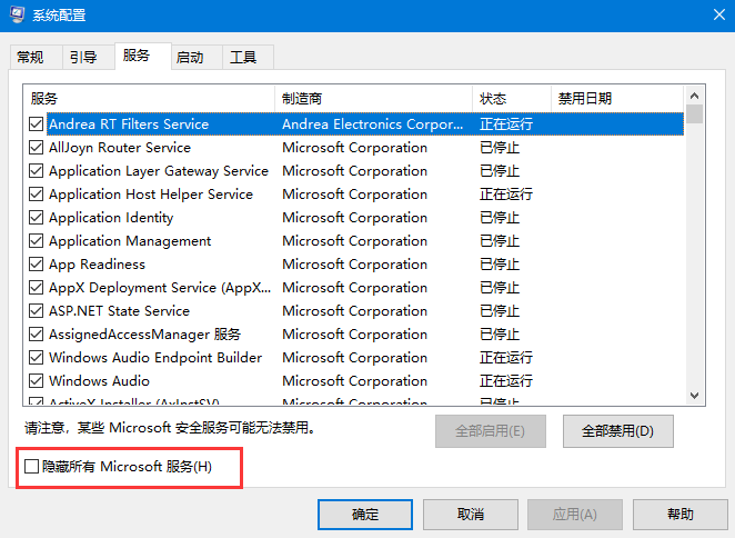 3、点击隐藏所有的microsoft服务。因为microsoft服务也就是我们所说的系统服务,隐藏之后我们就不会禁用到系统服务了。