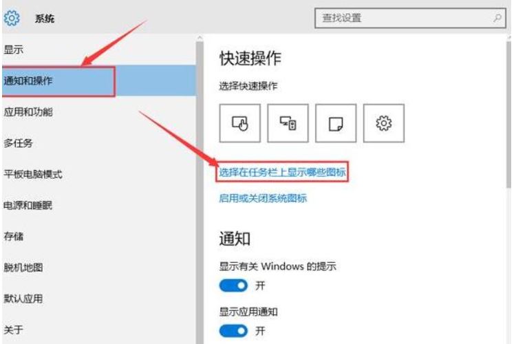 3、选择左侧的通知和操作,点击右侧的“选择在任务栏上显示哪些图标”
