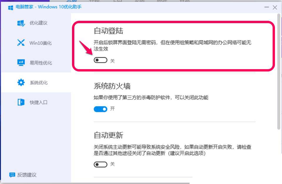 回到电脑管家 - Windows 10优化助手 - 自动登录 窗口中,我们就可以看到 自动登录下的【开关】处于【】的位置,退出电脑管家。