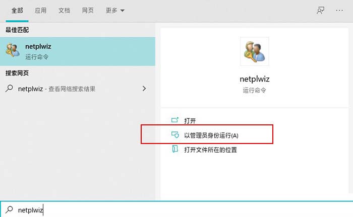 3、点击桌面左下角的搜索栏,输入“netplwiz”,然后右侧点击“以管理员身份运行”;