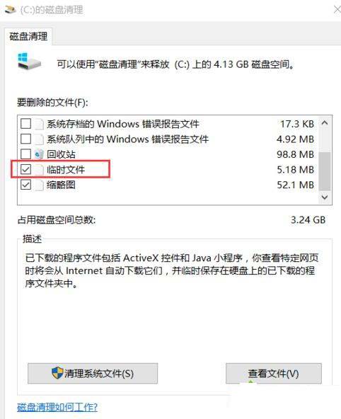 2、找到并单击“清理系统文件”按钮,开始对系统进行清理文件扫描,稍等待片刻后,进入“(C:)的磁盘清理”对话框。找到“临时文件”复选框,并打勾,单击“确定”按钮后,耐心等待清理完成即可。