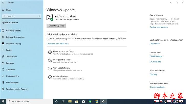 微软开始推送Windows 10版本1903的7月第二次累积更新补丁Build 18362.267。在Windows Update设置页面上,该修补程序将显示为“2019-07 Cumulative Update for Windows 10 version 1903 for x64-based systems (KB4505903)”。