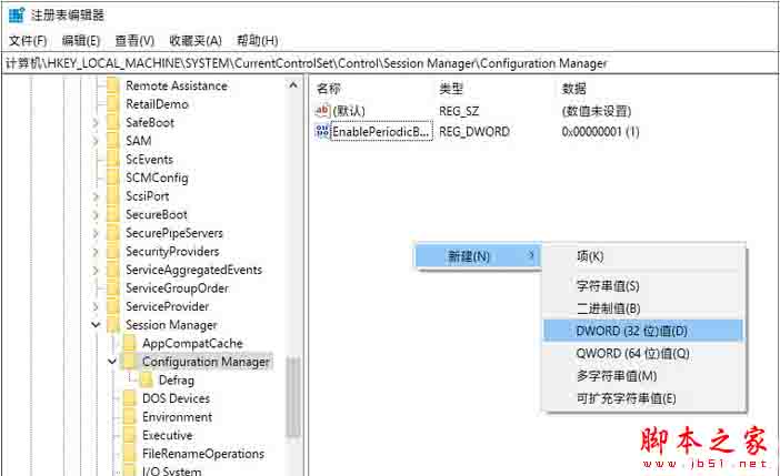 3. 右击窗格空白部分,选择“新建DWORD(32位)值”,将新键值命名为“EnablePeriodicBackup”;