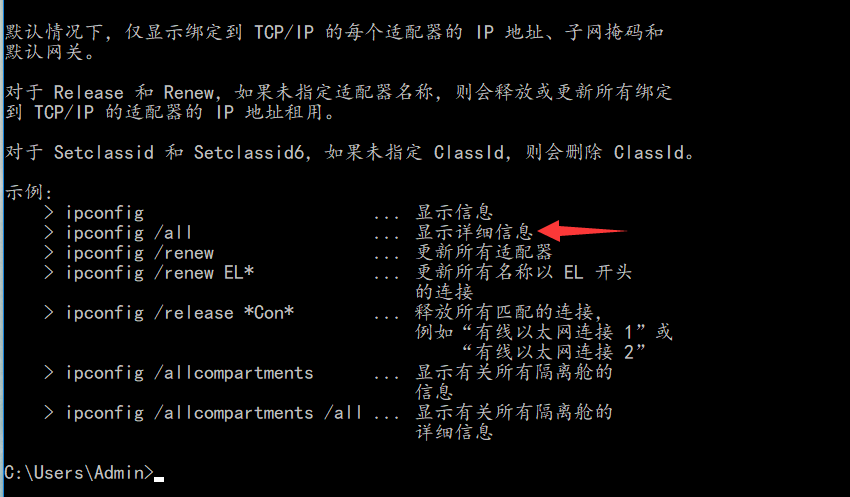 4、ipconfig /all命令根据帮助可以看到,是指查看ipconfig的详细信息。